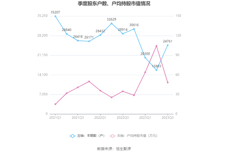 筹码集中度方面,截至2023年三季度末,公司股东总户数为2.48万户,较上半年末增长了8958户,增幅56.69%;户均持股市值由上半年末的104.38万元下降至48.31万元,降幅为53.72%。
