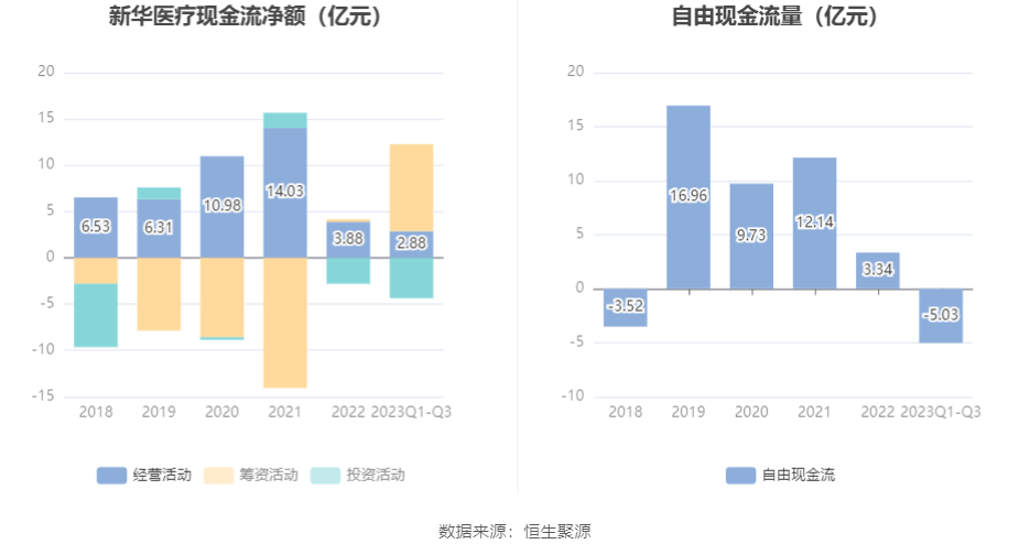 2023年前三季度,公司经营活动现金流净额为2.88亿元,同比增加3.42亿元,主要系公司医疗商贸板块经营活动产生的现金流量净额增加所致;筹资活动现金流净额9.40亿元,同比增加8.51亿元;投资活动现金流净额-4.37亿元,上年同期为-1.71亿元。