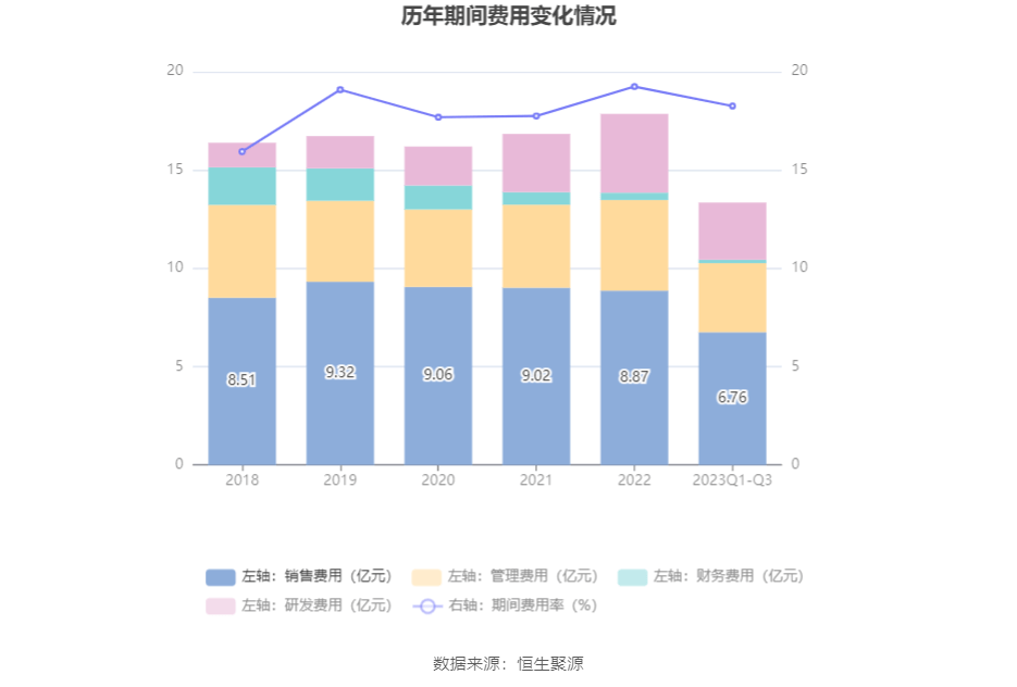 2023年前三季度,公司期间费用为13.36亿元,较上年同期增加1.26亿元;期间费用率为18.26%,较上年同期上升0.07个百分点。其中,销售费用同比增长14.58%,管理费用同比增长3.47%,研发费用同比增长20.11%,财务费用同比下降53.96%。