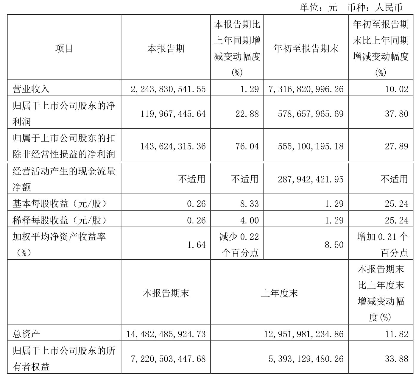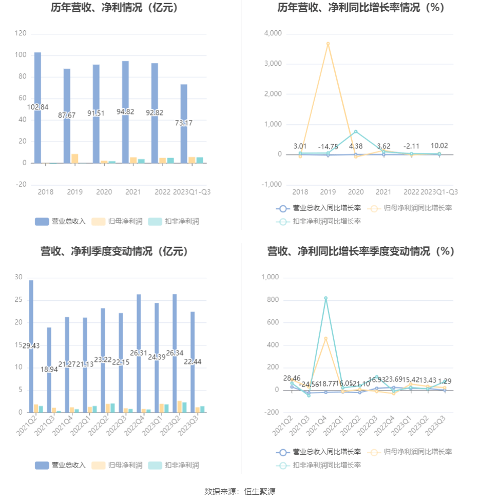 根据三季报,公司第三季度实现营业总收入22.44亿元,同比增长1.29%,环比下降14.82%;归母净利润1.2亿元,同比增长22.88%,环比下降54.24%;扣非净利润1.44亿元,同比增长76.04%,环比下降36.95%。