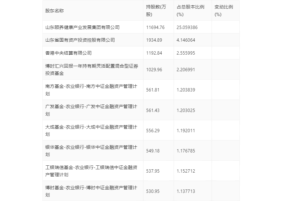 三季报显示,2023年三季度末公司十大流通股东中,新进股东为博时基金-农业银行-博时中证金融资产管理计划,取代了上半年末的中欧医疗健康混合型证券投资基金。在具体持股比例上,山东颐养健康产业发展集团有限公司、山东省国有资产投资控股有限公司、香港中央结算有限公司、博时汇兴回报一年持有期灵活配置混合型证券投资基金、南方基金-农业银行-南方中证金融资产管理计划、广发基金-农业银行-广发中证金融资产管理计划、大成基金-农业银行-大成中证金融资产管理计划、银华基金-农业银行-银华中证金融资产管理计划、工银瑞信基金-农业银行-工银瑞信中证金融资产管理计划持股有所上升。