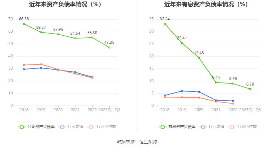 在偿债能力方面,公司2023年三季度末资产负债率为47.25%,相比上年末下降8.05个百分点;有息资产负债率为6.79%,相比上年末下降2.19个百分点。