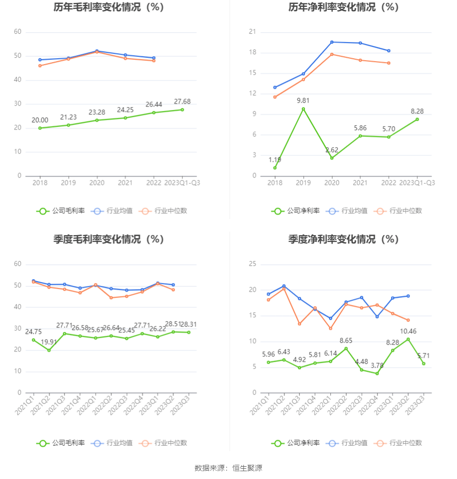2023年前三季度,公司毛利率为27.68%,同比上升1.74个百分点;净利率为8.28%,较上年同期上升1.82个百分点。从单季度指标来看,2023年第三季度公司毛利率为28.31%,同比上升2.86个百分点,环比下降0.20个百分点;净利率为5.71%,较上年同期上升1.23个百分点,较上一季度下降4.75个百分点。