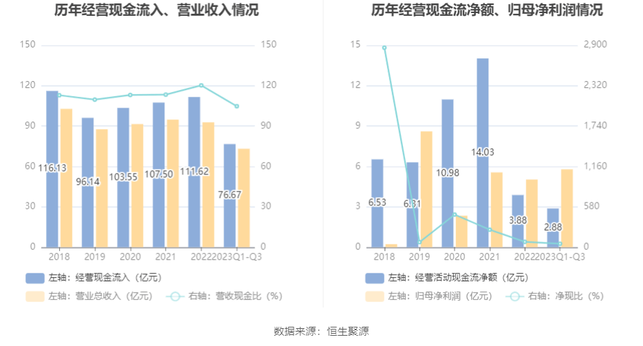 2023年前三季度,公司营业收入现金比为104.79%,净现比为49.76%。