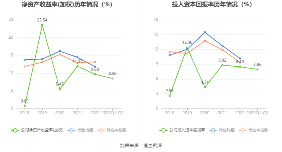 数据显示,2023年前三季度公司加权平均净资产收益率为8.50%,较上年同期增长0.31个百分点;公司2023年前三季度投入资本回报率为7.96%,较上年同期增长1.10个百分点。
