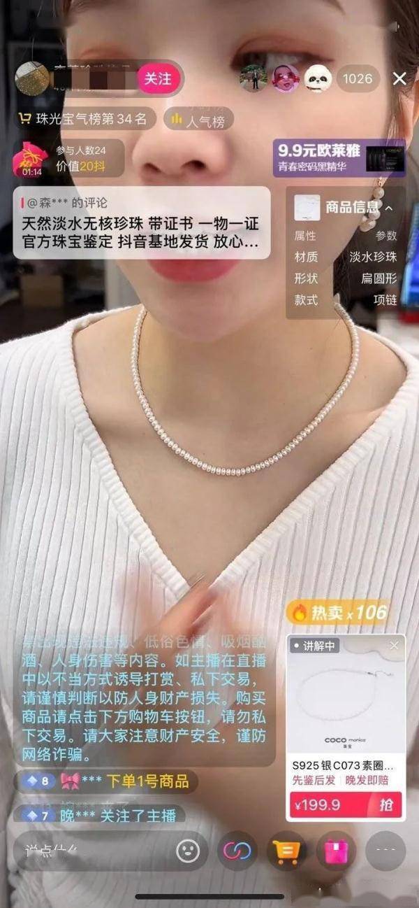 除线下购买火爆外,线上交易同样热闹,几百到几千元不等的珍珠饰品通过直播间的链接传递到无数人手中。珍珠不再是妈妈辈人群的专属,变成了年轻人也在追寻的流行单品。