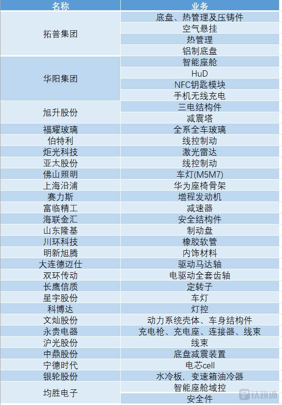 “华为汽车”概念供应链一览表 钛媒体APP制图