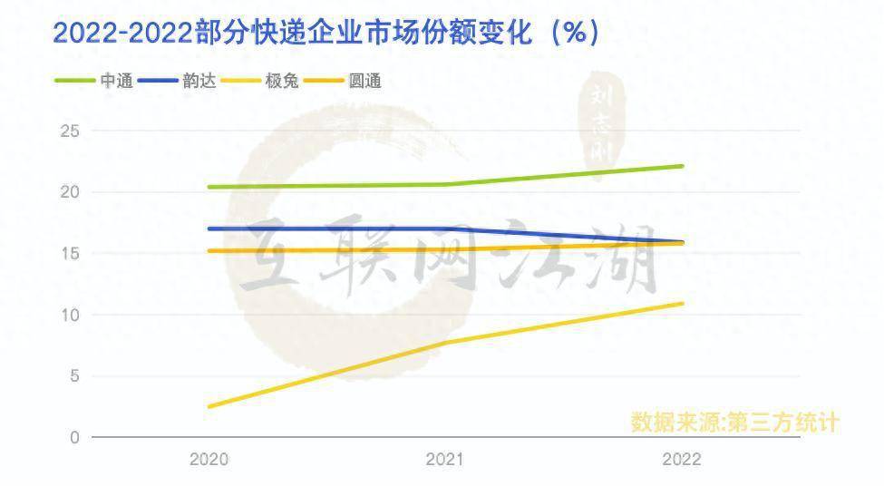 2020 年到 2022 年,快递企业市场份额变化中,中通从 20.4% 增长到 22.1%,韵达从 17% 下滑到 15.9%,圆通从 15.2% 微微上升到 15.8%,申通从 10.6% 微增到 11.7% ……