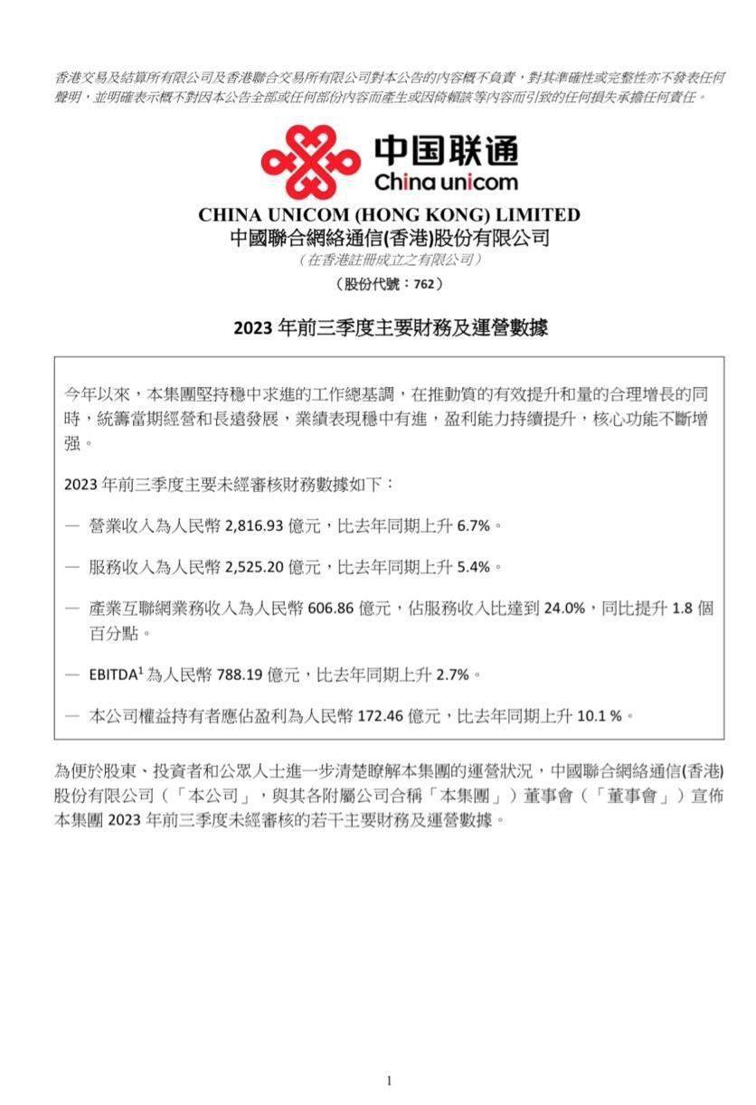 此外,中国联通前三季度权益持有者应占盈利为人民币 172.46 亿元,比 2022 年同期上升 10.1%。