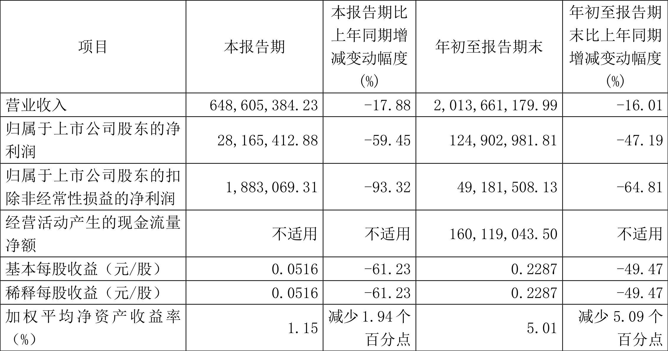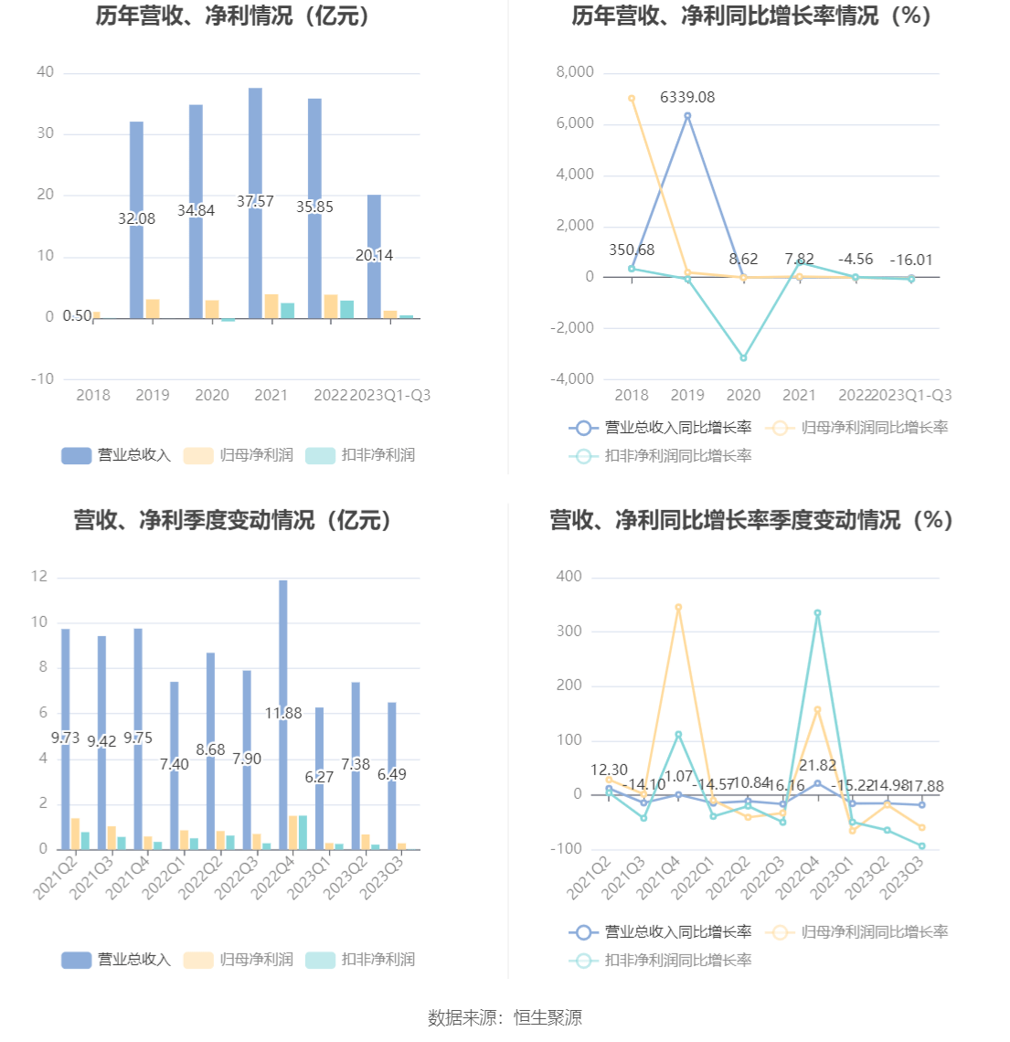 根据三季报,公司第三季度实现营业总收入6.49亿元,同比下降17.88%,环比下降12.08%;归母净利润2816.54万元,同比下降59.45%,环比下降58.24%;扣非净利润188.31万元,同比下降93.32%,环比下降91.49%。