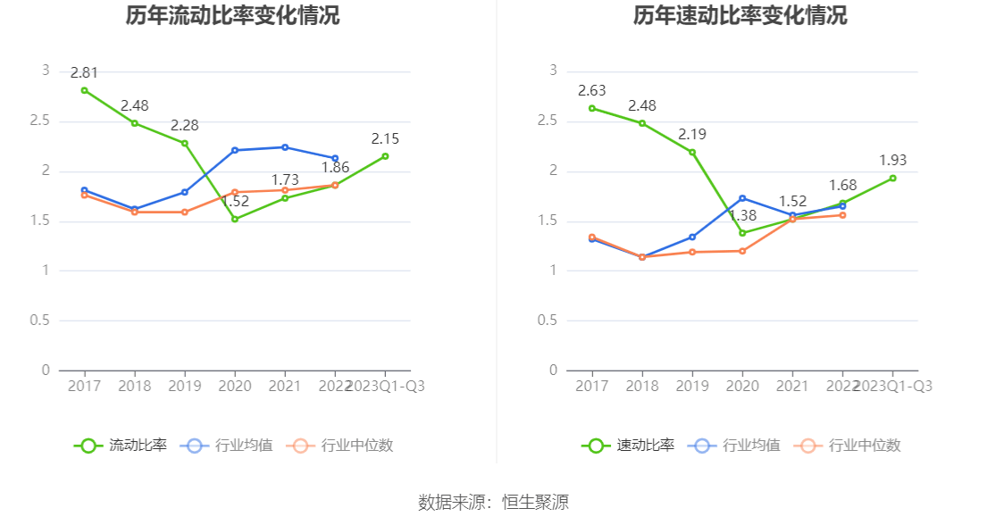 2023年前三季度,公司流动比率为2.15,速动比率为1.93。