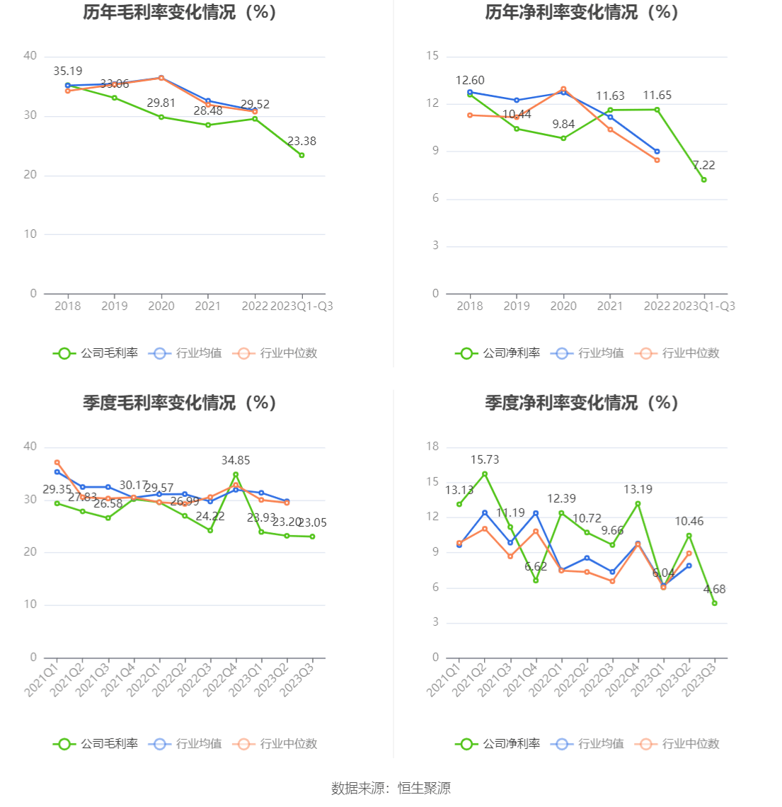 2023年前三季度,公司毛利率为23.38%,同比下降3.49个百分点;净利率为7.22%,较上年同期下降3.67个百分点。从单季度指标来看,2023年第三季度公司毛利率为23.05%,同比下降1.17个百分点,环比下降0.15个百分点;净利率为4.68%,较上年同期下降4.98个百分点,较上一季度下降5.78个百分点。