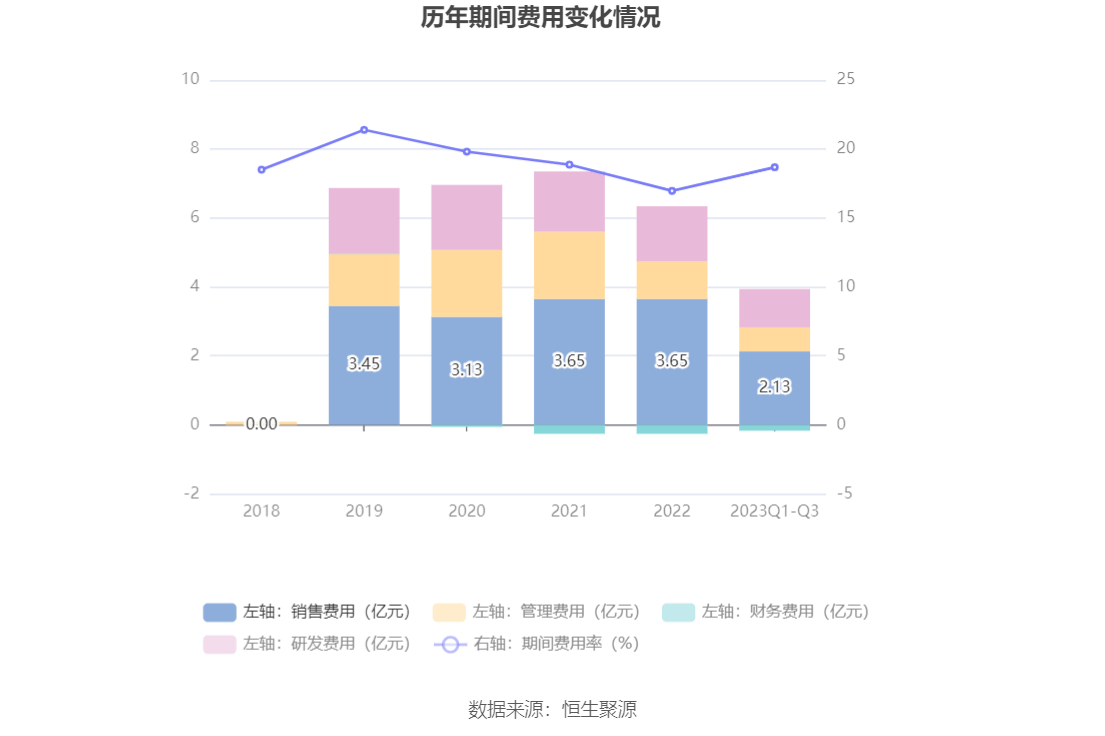 2023年前三季度,公司期间费用为3.76亿元,较上年同期减少5799.35万元;但期间费用率为18.68%,较上年同期上升0.57个百分点。其中,销售费用同比下降12.96%,管理费用同比下降19.06%,研发费用同比下降18.01%,财务费用由去年同期的-3191.07万元变为-1737.68万元。