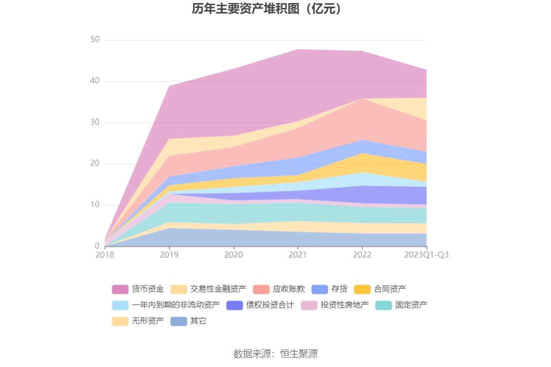 资产重大变化方面,截至2023年三季度末,公司货币资金较上年末减少40.84%,占公司总资产比重下降8.41个百分点;一年内到期的非流动资产较上年末减少62.49%,占公司总资产比重下降3.98个百分点;应收账款较上年末减少24.21%,占公司总资产比重下降3.41个百分点;债权投资合计较上年末增加0.25%,占公司总资产比重上升0.99个百分点。