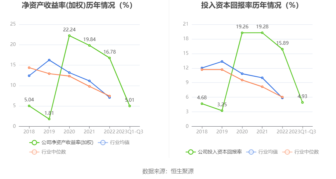 数据显示,2023年前三季度公司加权平均净资产收益率为5.01%,较上年同期下降5.09个百分点;公司2023年前三季度投入资本回报率为4.93%,较上年同期下降4.61个百分点。