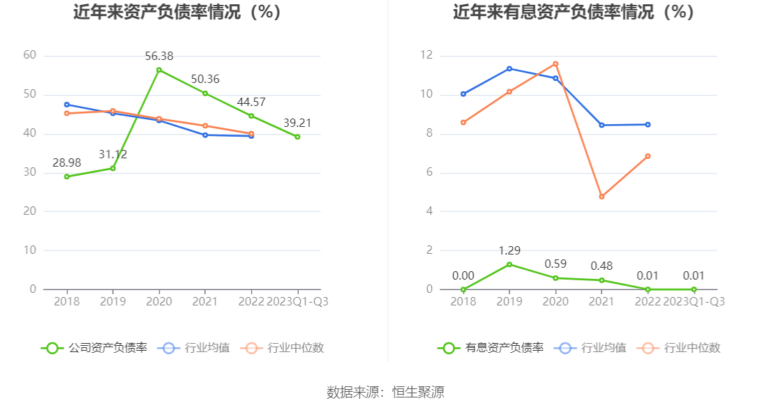 在偿债能力方面,公司2023年三季度末资产负债率为39.21%,相比上年末下降5.36个百分点;有息资产负债率为0.01%,相比上年末基本持平。
