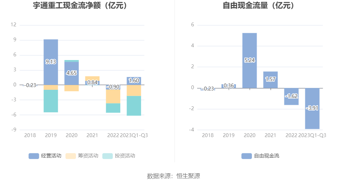2023年前三季度,公司经营活动现金流净额为1.60亿元,同比增加2.14亿元,主要系应收账款规模下降影响所致;筹资活动现金流净额-2.19亿元,同比增加716.52万元;投资活动现金流净额-3.95亿元,上年同期为-5.28亿元。