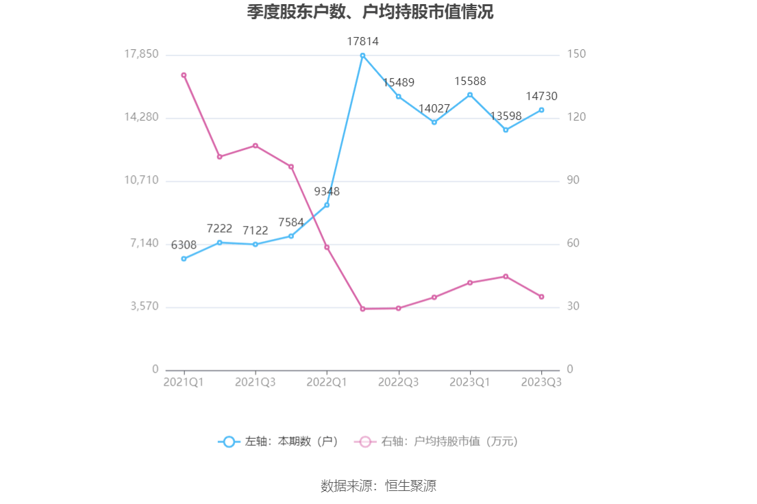 筹码集中度方面,截至2023年三季度末,公司股东总户数为1.47万户,较上半年末增长了1132户,增幅8.32%;户均持股市值由上半年末的44.56万元下降至34.92万元,降幅为21.63%。