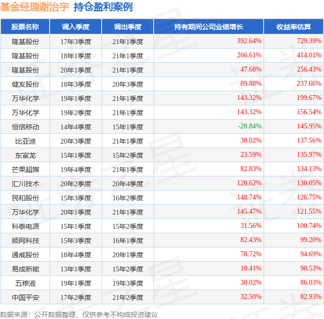 谢治宇管理的兴全合润混合(LOF)基金在17年3季度买入隆基股份,在持有3年又2个季度后在21年1季度卖出。持有期间的估算收益率为729.39%,持有期间隆基股份在2017年到2021年的年报营业总收入增幅达392.64%。