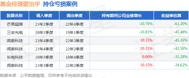 谢治宇管理的兴全合宜混合(LOF)A基金在21年2季度买入芒果超媒,在持有1年又2个季度后在22年4季度卖出。持有期间的估算收益率为-61.2%,持有期间芒果超媒在2021年到2022年的年报营业总收入降幅为10.76%。