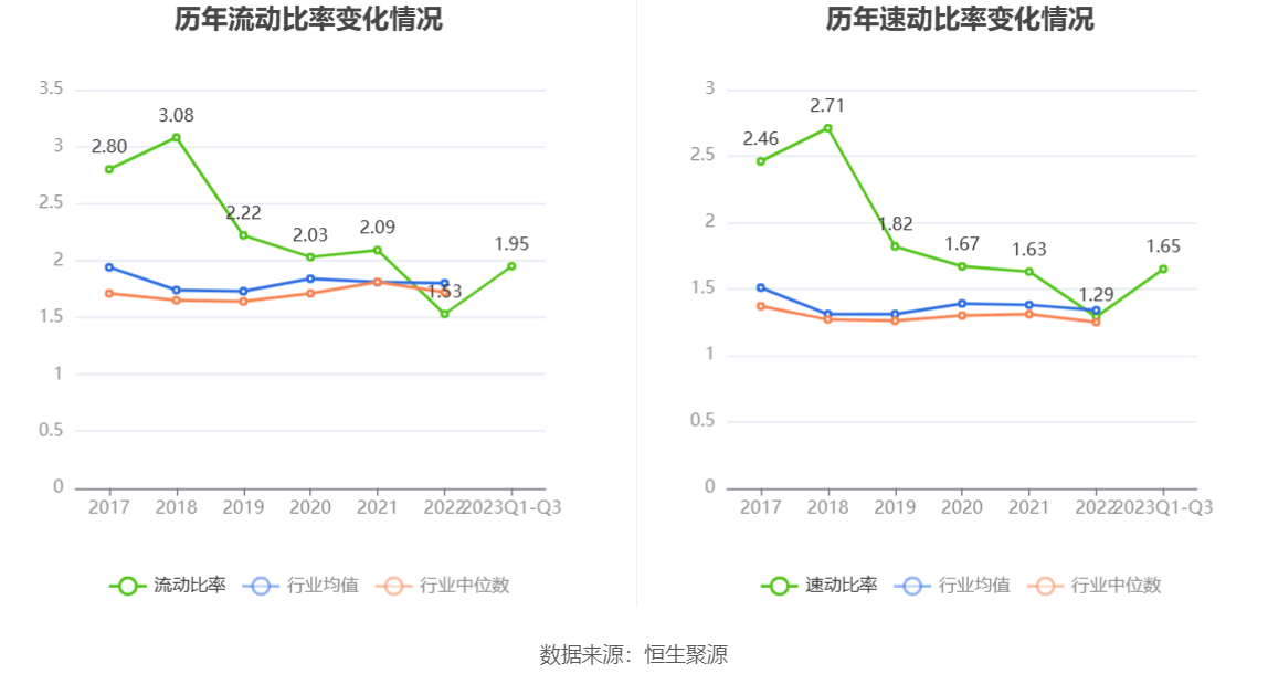 2023年前三季度,公司流动比率为1.95,速动比率为1.65。