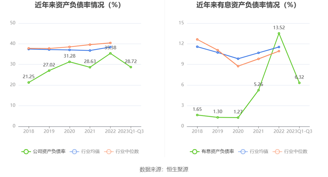 在偿债能力方面,公司2023年三季度末资产负债率为28.72%,相比上年末下降6.66个百分点;有息资产负债率为6.32%,相比上年末下降7.20个百分点。