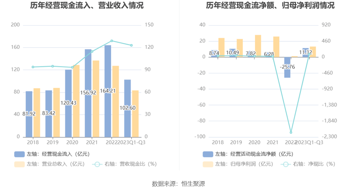 2023年前三季度,公司经营活动现金流净额为11.32亿元,同比增加44.40亿元;筹资活动现金流净额-24.76亿元,同比减少33.36亿元;投资活动现金流净额6.45亿元,上年同期为25.62亿元。