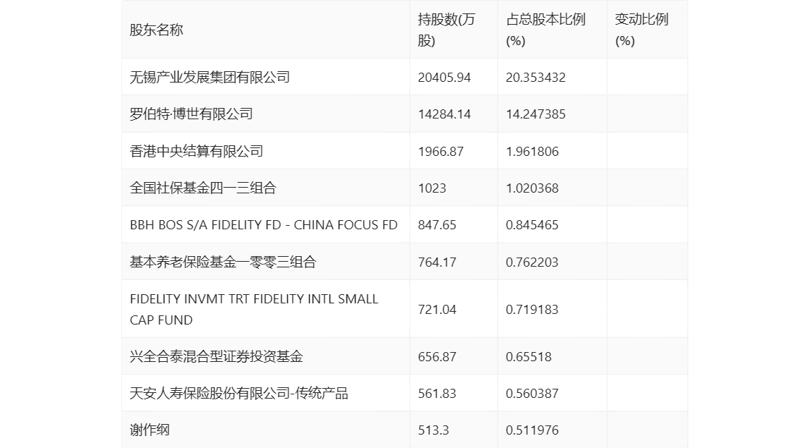 三季报显示,2023年三季度末公司十大流通股东中,新进股东为兴全合泰混合型证券投资基金、天安人寿保险股份有限公司-传统产品,取代了上半年末的罗伯特·博世有限公司、中国平安人寿保险股份有限公司-投连-个险投连、上海重阳战略投资有限公司-重阳战略英智基金。在具体持股比例上,FIDELITY INVMT TRT FIDELITY INTL SMALL CAP FUND持股有所上升,香港中央结算有限公司、全国社保基金四一三组合、BBH BOS S/A FIDELITY FD - CHINA FOCUS FD、基本养老保险基金一零零三组合持股有所下降。