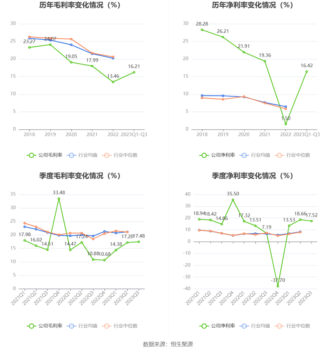 2023年前三季度,公司毛利率为16.21%,同比上升1.90个百分点;净利率为16.42%,较上年同期上升2.91个百分点。从单季度指标来看,2023年第三季度公司毛利率为17.48%,同比上升6.60个百分点,环比上升0.28个百分点;净利率为17.52%,较上年同期上升10.33个百分点,较上一季度下降1.14个百分点。