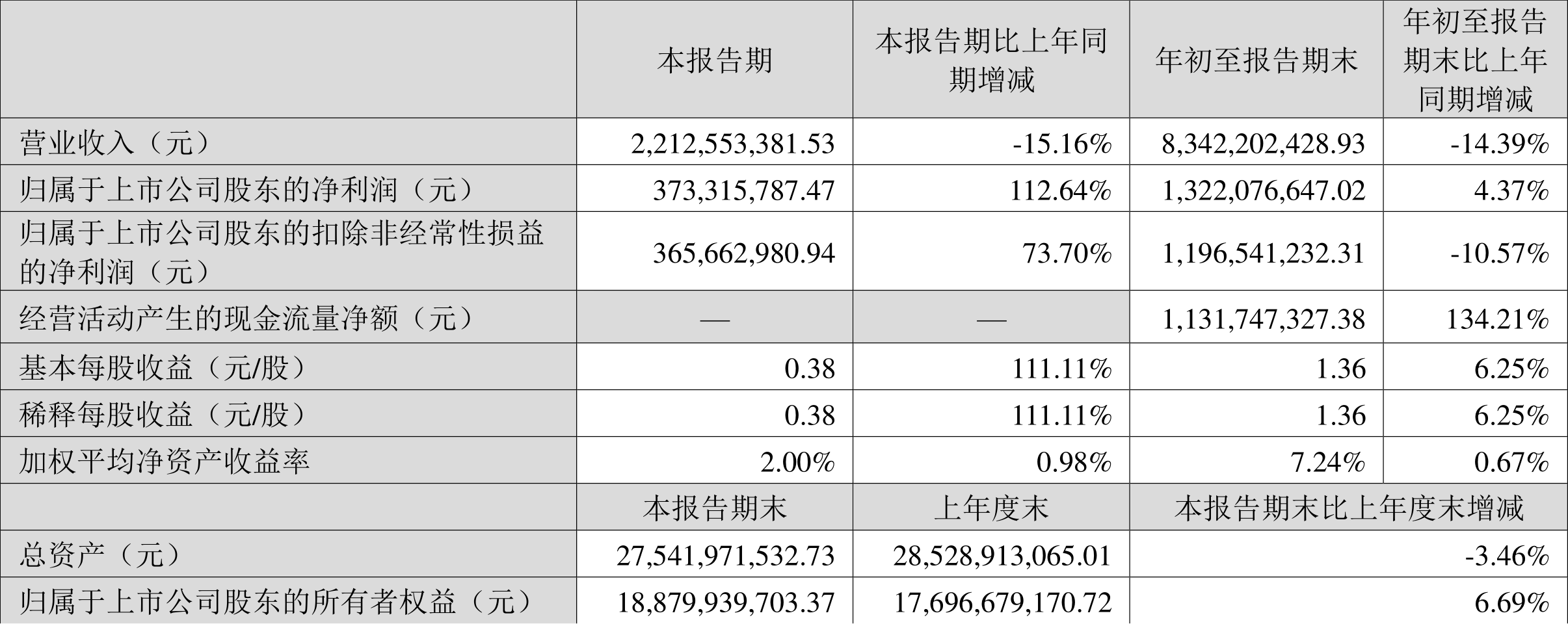根据三季报,公司第三季度实现营业总收入22.13亿元,同比下降15.16%,环比下降25.88%;归母净利润3.73亿元,同比增长112.64%,环比下降30.09%;扣非净利润3.66亿元,同比增长73.70%,环比下降23.07%。