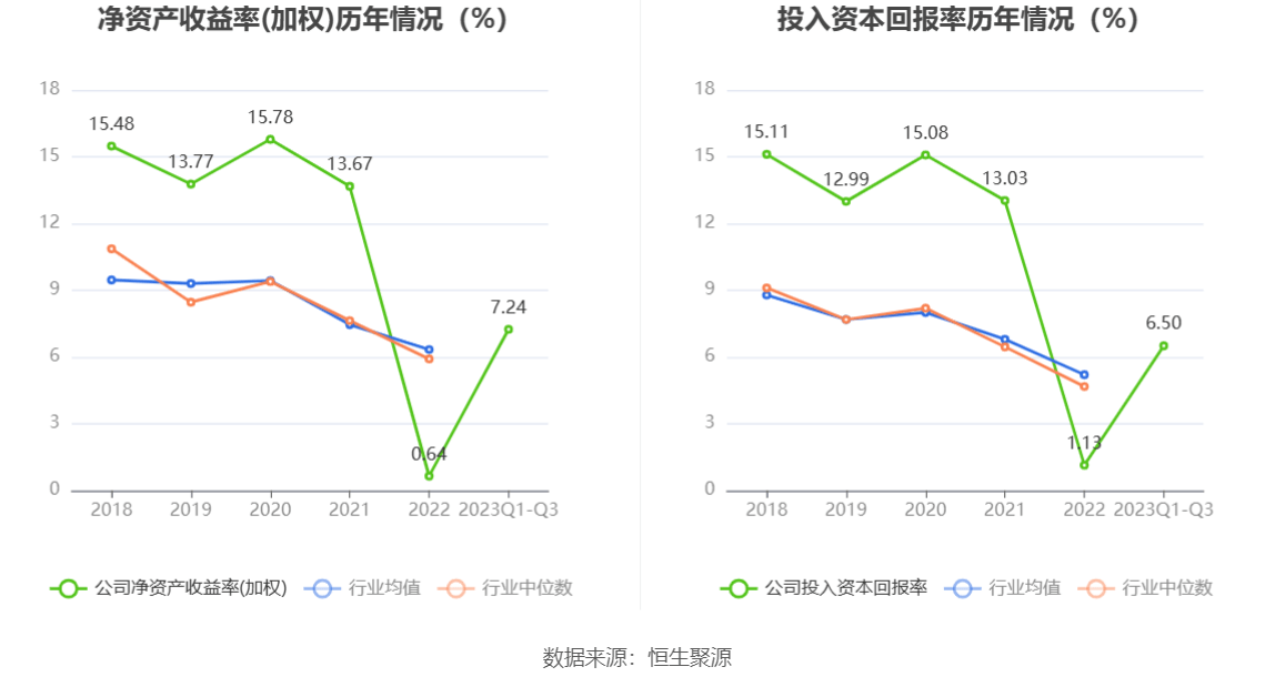 数据显示,2023年前三季度公司加权平均净资产收益率为7.24%,较上年同期增长0.67个百分点;公司2023年前三季度投入资本回报率为6.50%,较上年同期增长0.48个百分点。