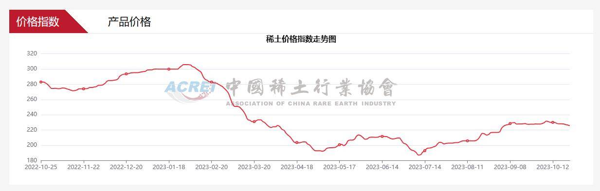 中国稀土行业协会数据显示,稀土价格指数从2023年2月2日的305.7745震荡下跌至7月11日的187.4247,跌幅超38%,随后价格指数才有所回升,截至10月23日,该价格指数为226.6512。