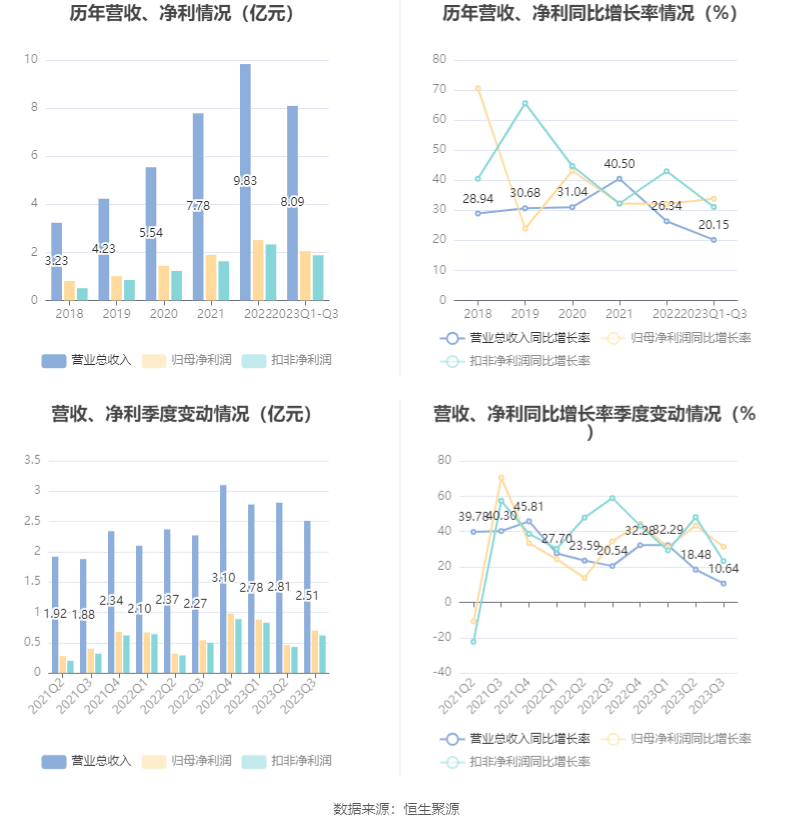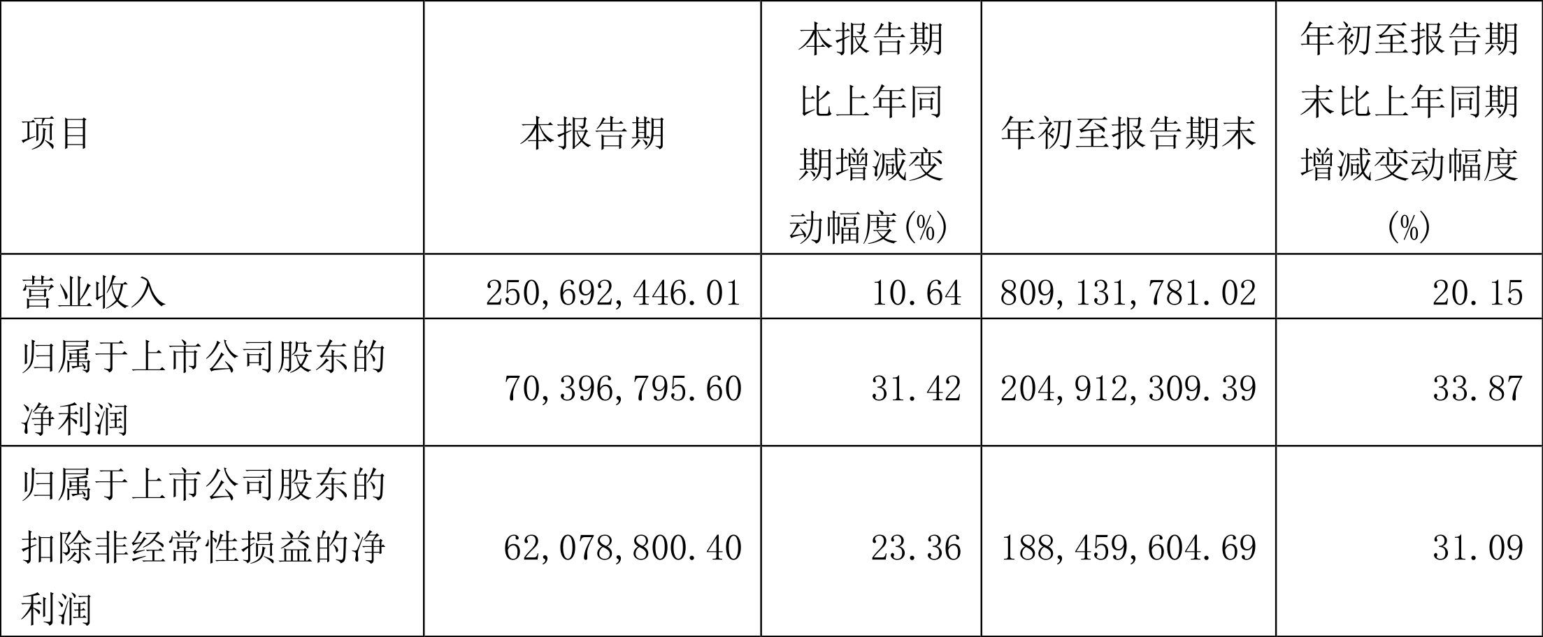 根据三季报,公司第三季度实现营业总收入2.51亿元,同比增长10.64%,环比下降10.67%;归母净利润7039.68万元,同比增长31.42%,环比增长51.69%;扣非净利润6207.88万元,同比增长23.36%,环比增长42.76%。