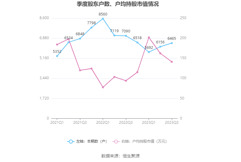 筹码集中度方面,截至2023年三季度末,公司股东总户数为6465户,较上半年末增长了309户,增幅5.02%;户均持股市值由上半年末的162.42万元下降至141.28万元,降幅为13.02%。