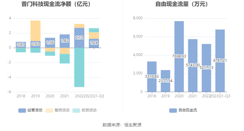 2023年前三季度,公司经营活动现金流净额为1.24亿元,同比增长13.94%;筹资活动现金流净额8671.24万元,同比减少1607.64万元;投资活动现金流净额5531.07万元,上年同期为-1.64亿元。