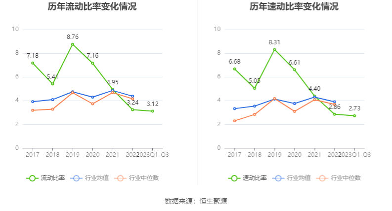 2023年前三季度,公司流动比率为3.12,速动比率为2.73。