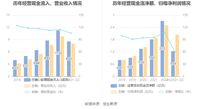 2023年前三季度,公司营业收入现金比为106.28%,净现比为60.36%。