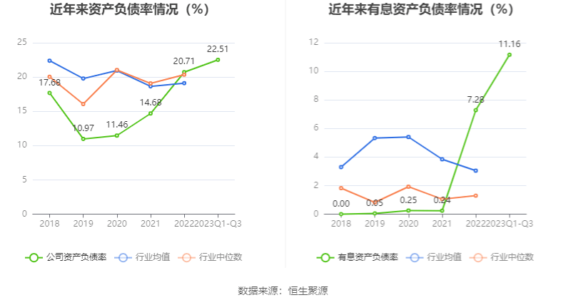 在偿债能力方面,公司2023年三季度末资产负债率为22.51%,相比上年末上升1.80个百分点;有息资产负债率为11.16%,相比上年末上升3.88个百分点。