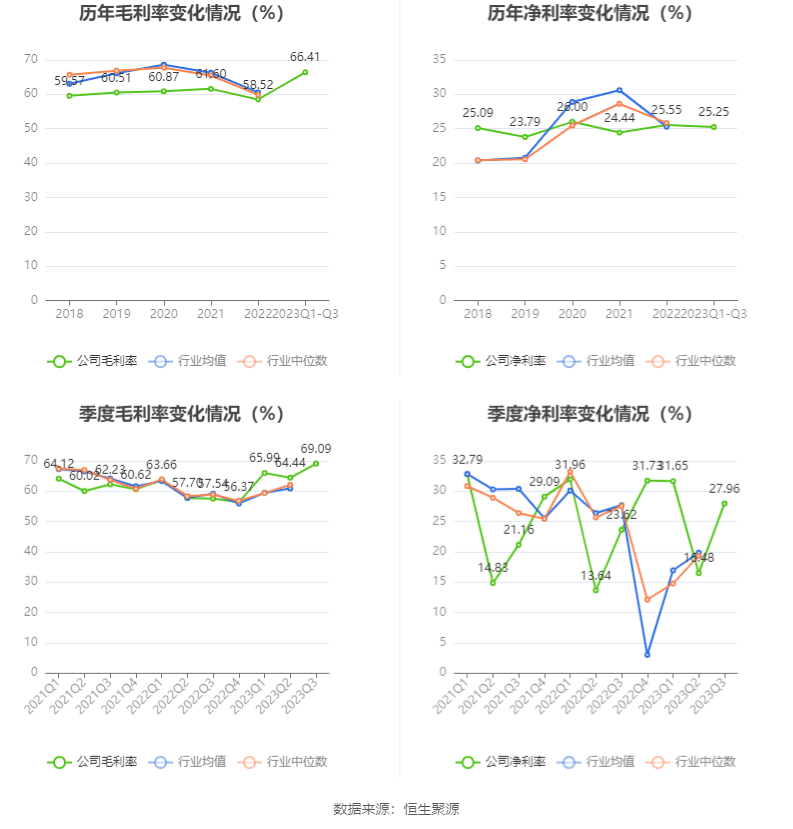 2023年前三季度,公司毛利率为66.41%,同比上升6.90个百分点;净利率为25.25%,较上年同期上升2.54个百分点。从单季度指标来看,2023年第三季度公司毛利率为69.09%,同比上升11.55个百分点,环比上升4.65个百分点;净利率为27.96%,较上年同期上升4.34个百分点,较上一季度上升11.48个百分点。