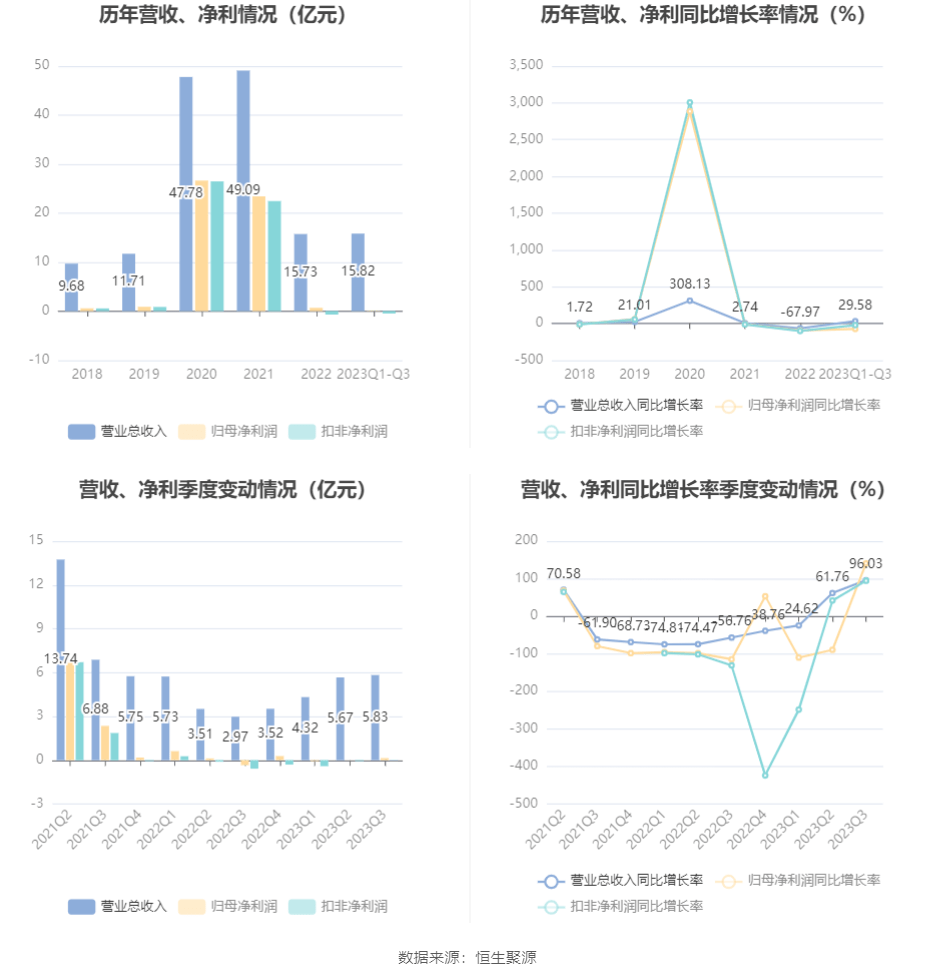 根据三季报,公司第三季度实现营业总收入5.83亿元,同比增长96.03%,环比增长2.77%;归母净利润1413.98万元,同比增长141.00%,环比增长1047.60%;扣非净利润-317.64万元,同比增长94.48%,环比增长42.34%。