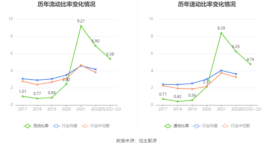 2023年前三季度,公司流动比率为5.38,速动比率为4.76。