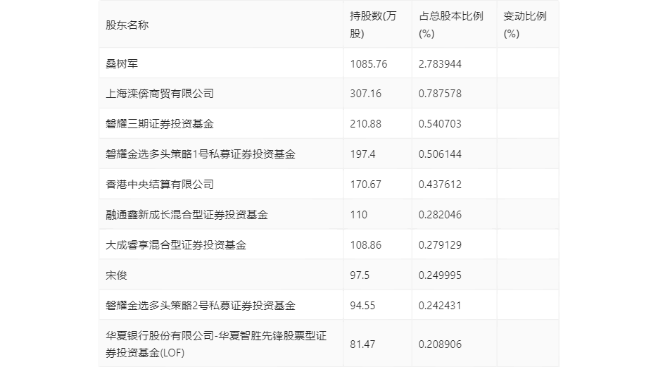 三季报显示,2023年三季度末公司十大流通股东中,新进股东为香港中央结算有限公司、华夏银行股份有限公司-华夏智胜先锋股票型证券投资基金(LOF),取代了上半年末的广发科技创新混合型证券投资基金、磐耀永达私募证券投资基金。在具体持股比例上,磐耀金选多头策略1号私募证券投资基金、大成睿享混合型证券投资基金持股有所上升,上海滦倴商贸有限公司、磐耀三期证券投资基金、融通鑫新成长混合型证券投资基金、磐耀金选多头策略2号私募证券投资基金持股有所下降。
