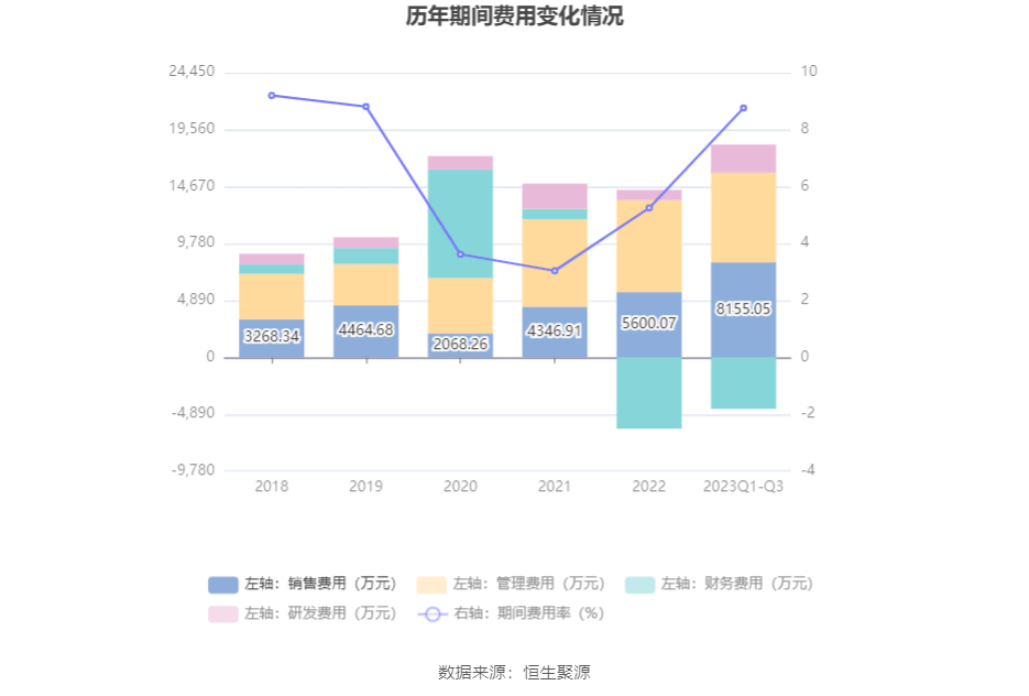 2023年前三季度,公司期间费用为1.39亿元,较上年同期增加8943.43万元;期间费用率为8.76%,较上年同期上升4.74个百分点。其中,销售费用同比增长106.42%,管理费用同比增长26.55%,研发费用同比增长223.94%,财务费用由去年同期的-5878.83万元变为-4425.75万元。