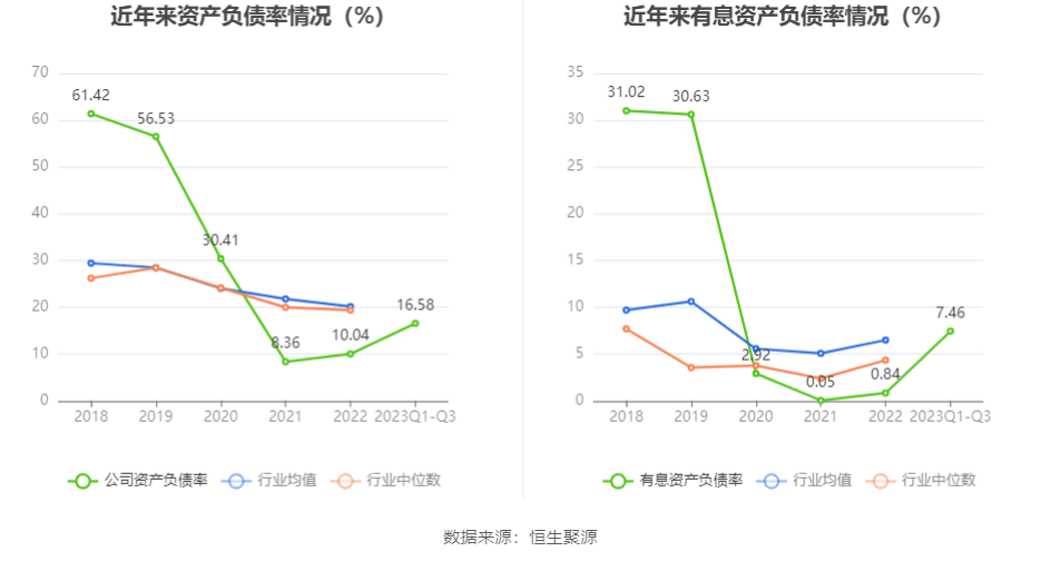 在偿债能力方面,公司2023年三季度末资产负债率为16.58%,相比上年末上升6.54个百分点;有息资产负债率为7.46%,相比上年末上升6.62个百分点。
