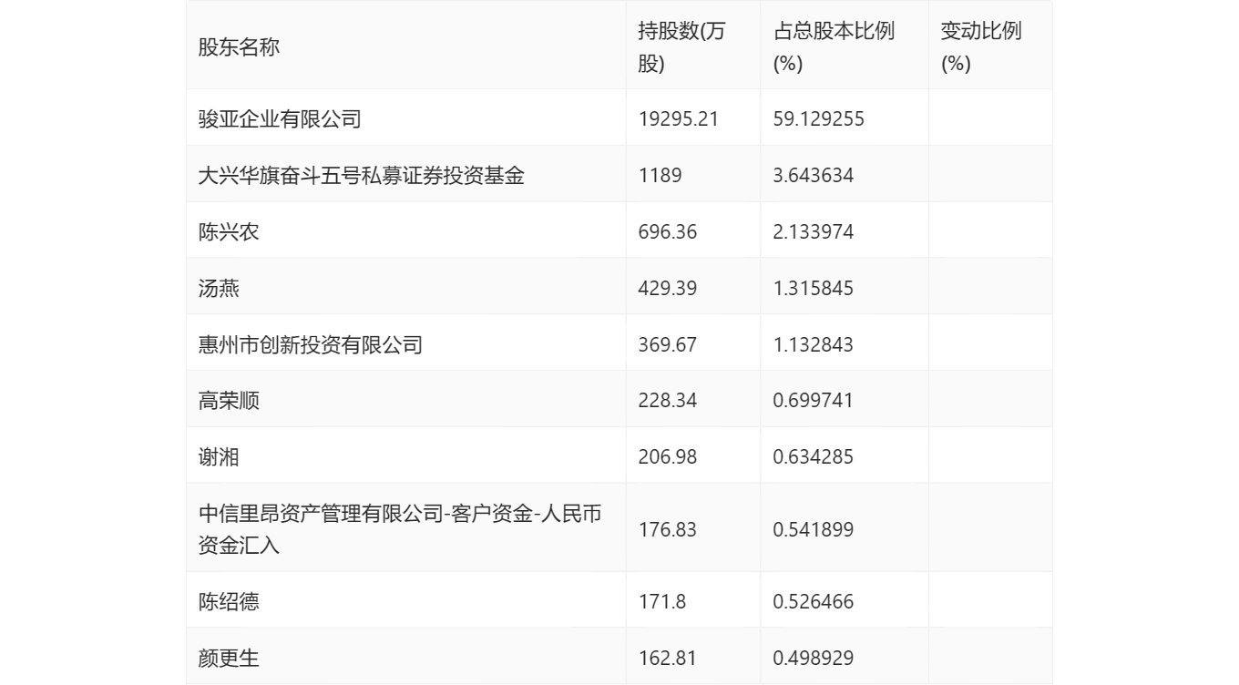 三季报显示,2023年三季度末公司十大流通股东中,新进股东为汤燕、中信里昂资产管理有限公司-客户资金-人民币资金汇入,取代了上半年末的董友全、彭湘。在具体持股比例上,骏亚企业有限公司、陈兴农、高荣顺、谢湘、颜更生持股有所下降。