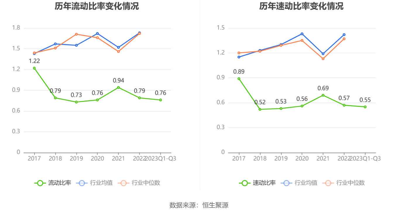 2023年前三季度,公司流动比率为0.76,速动比率为0.55。