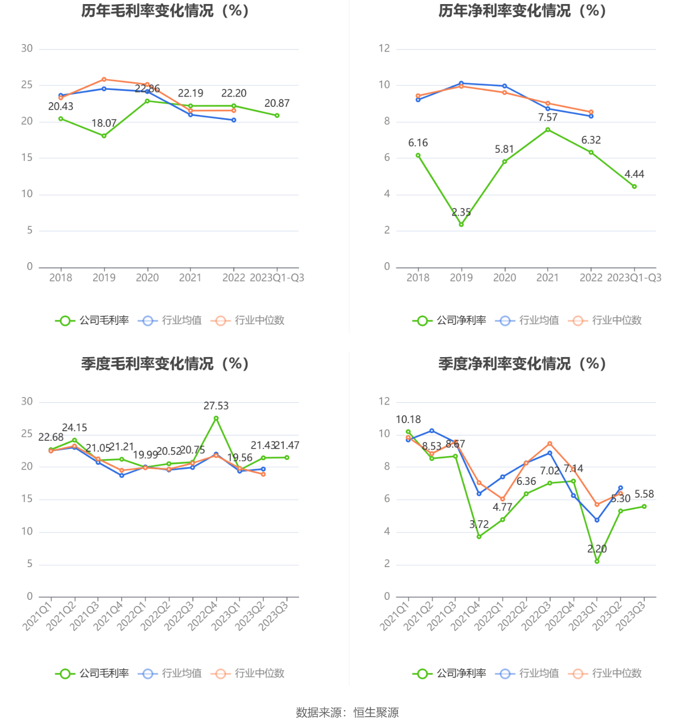 2023年前三季度,公司毛利率为20.87%,同比上升0.45个百分点;净利率为4.44%,较上年同期下降1.61个百分点。从单季度指标来看,2023年第三季度公司毛利率为21.47%,同比上升0.72个百分点,环比上升0.04个百分点;净利率为5.58%,较上年同期下降1.44个百分点,较上一季度上升0.28个百分点。