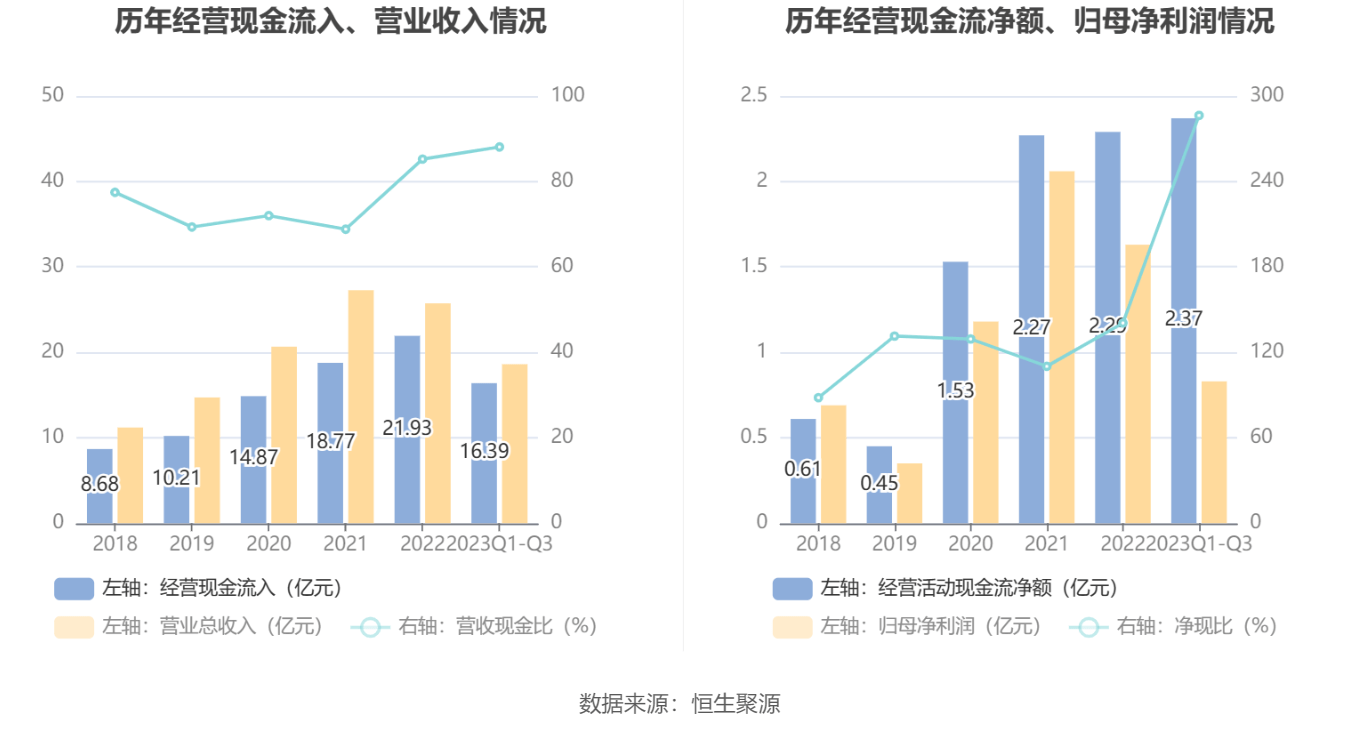 2023年前三季度,公司营业收入现金比为88.08%,净现比为286.39%。