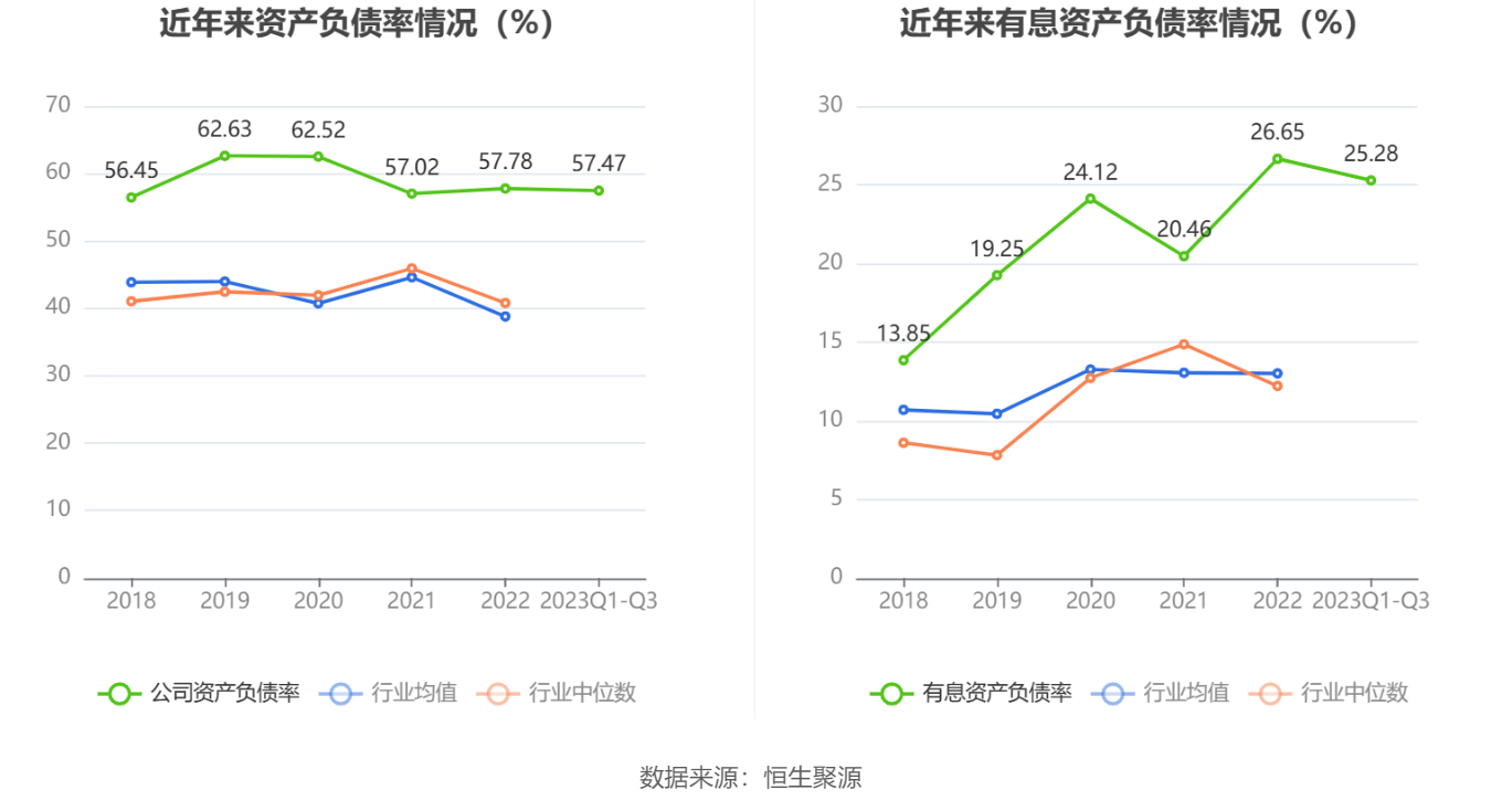 在偿债能力方面,公司2023年三季度末资产负债率为57.47%,相比上年末下降0.31个百分点;有息资产负债率为25.28%,相比上年末下降1.37个百分点。