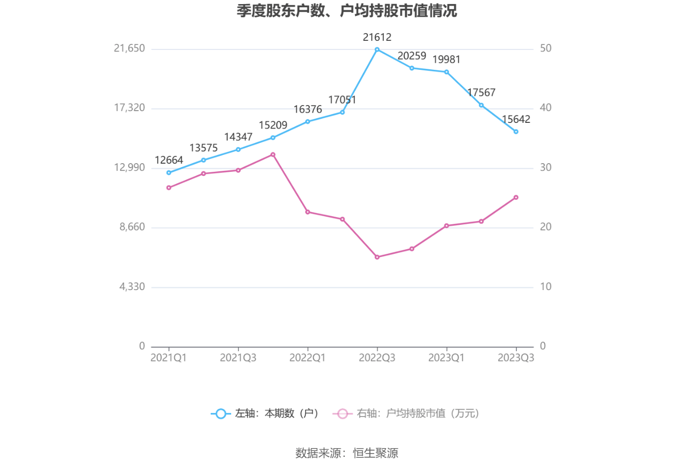 筹码集中度方面,截至2023年三季度末,公司股东总户数为1.56万户,较上半年末下降了1925户,降幅10.96%;户均持股市值由上半年末的21.08万元上升至25.10万元,增幅为19.07%。